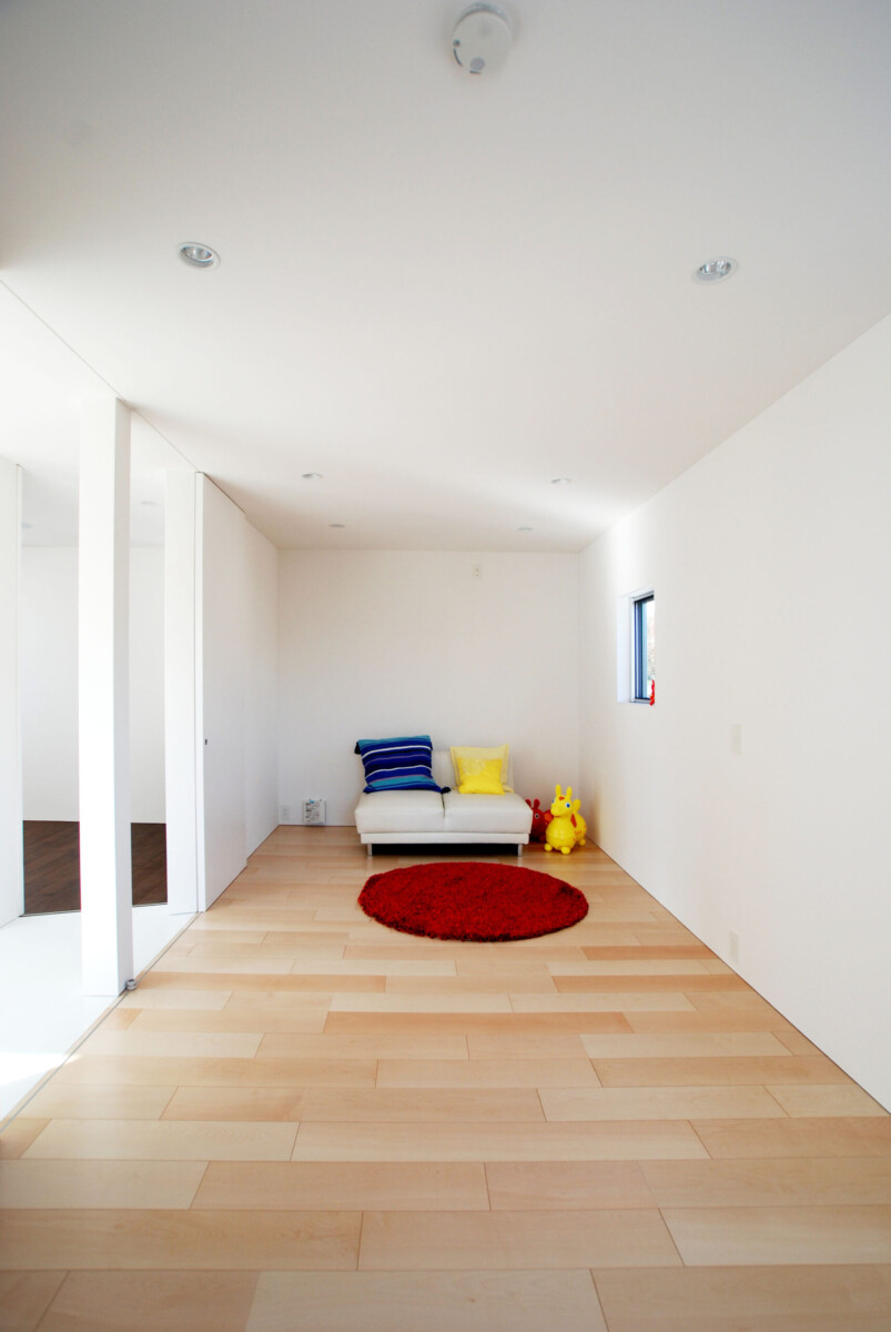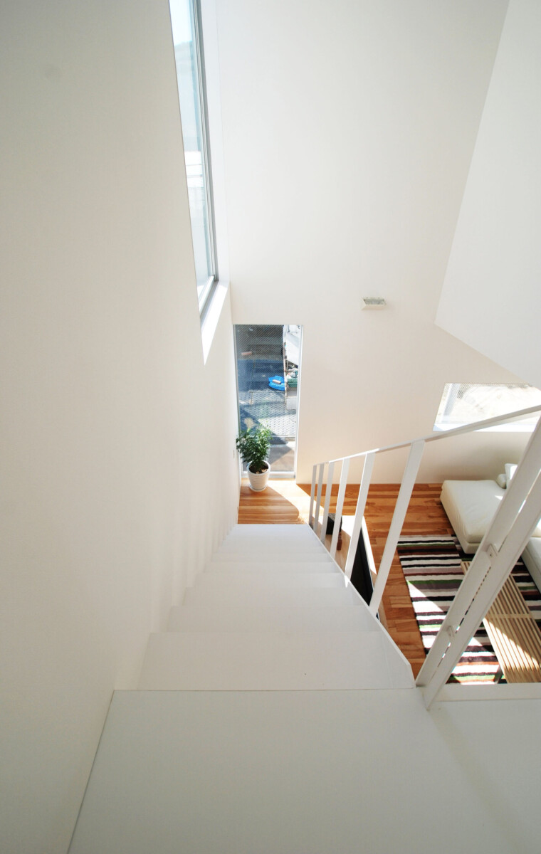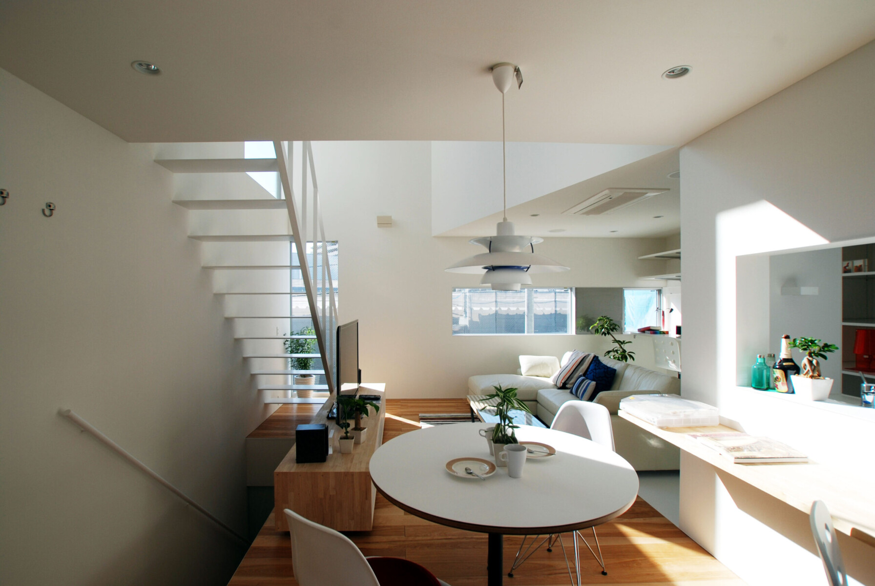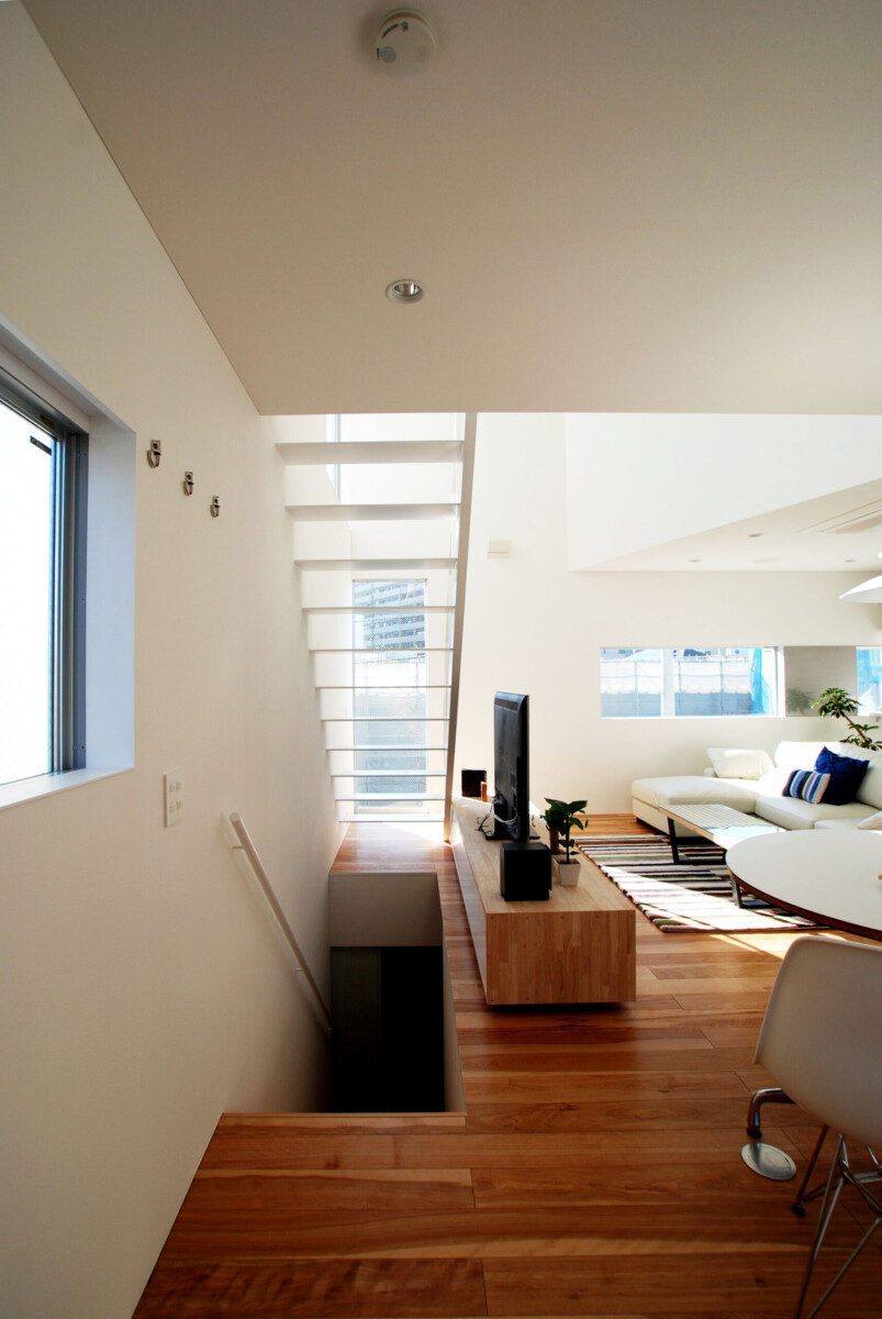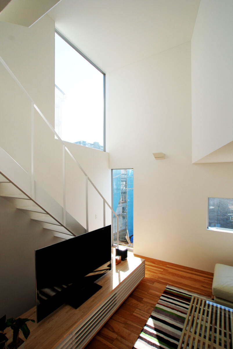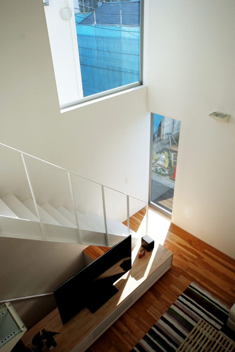吹抜け周囲には大小のピクチャーウィンドウが丁寧にデザインされ、内部の壁に美しい印影を作り出す。