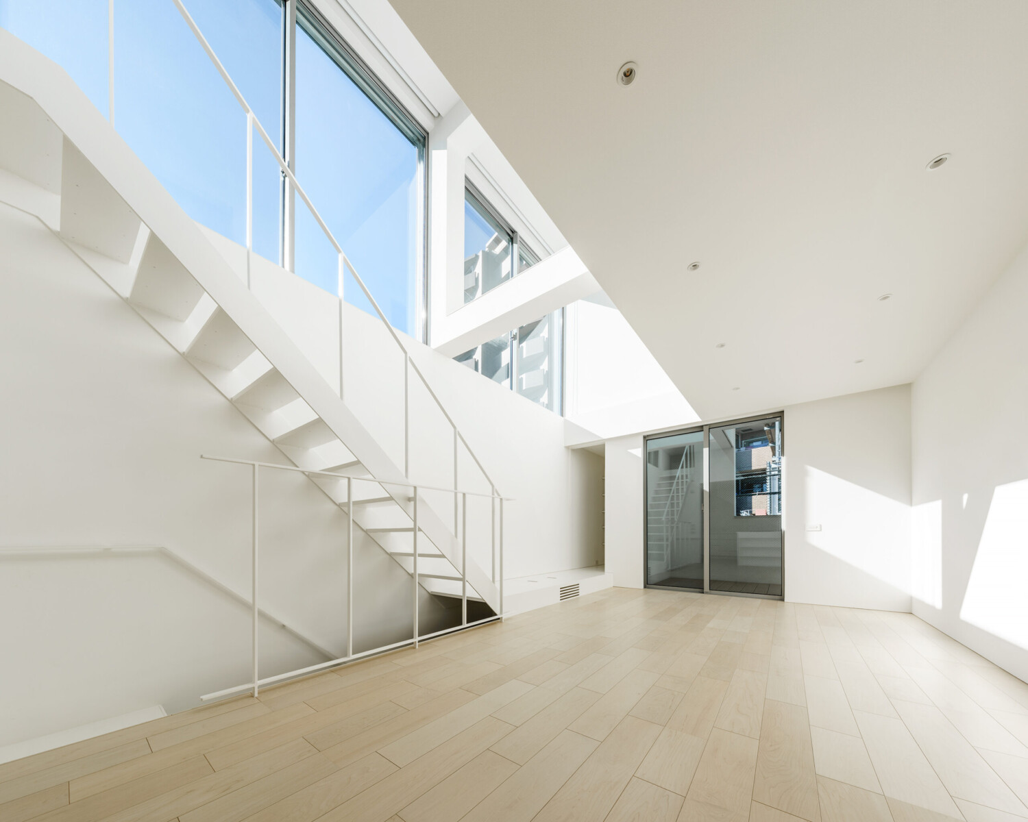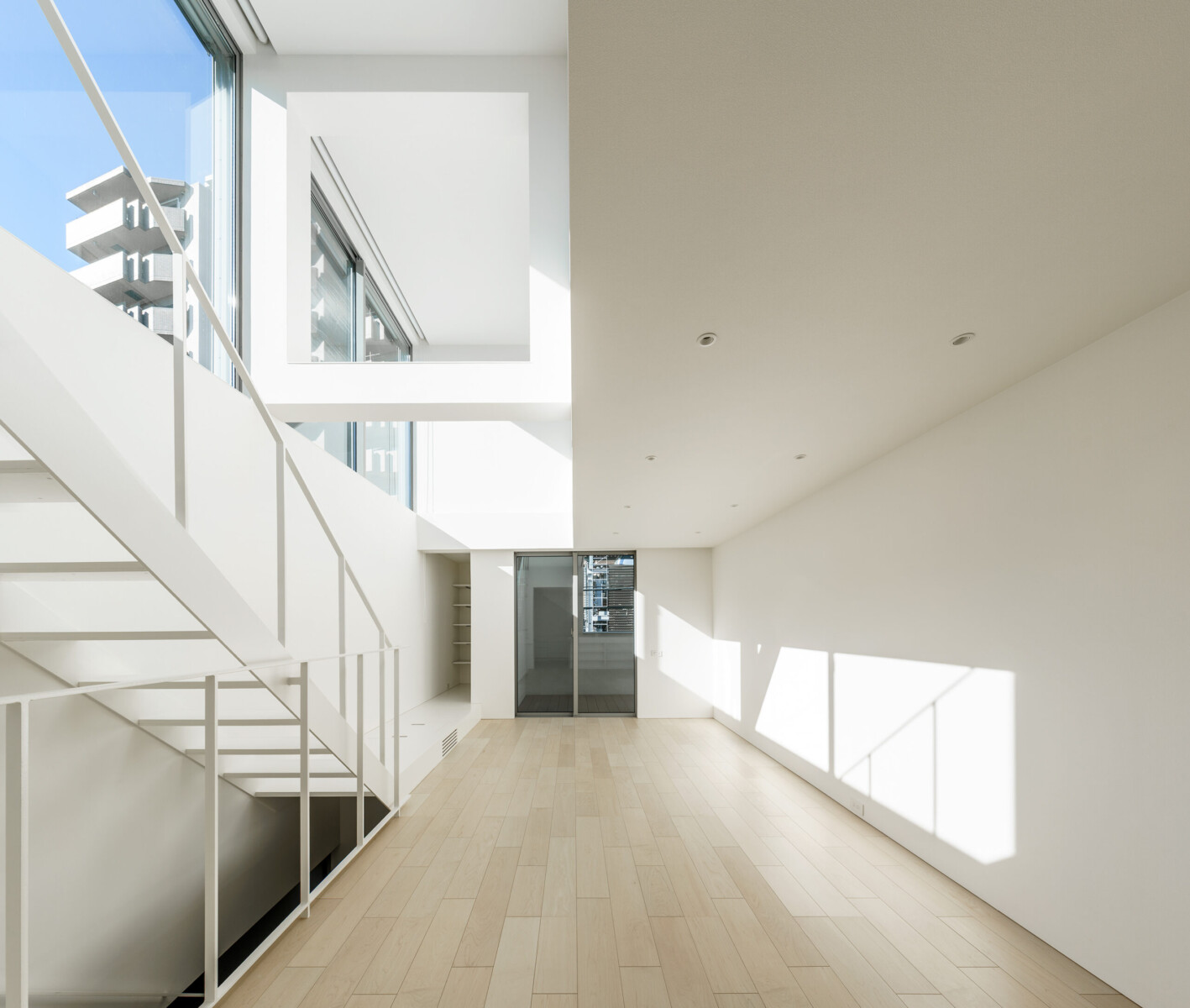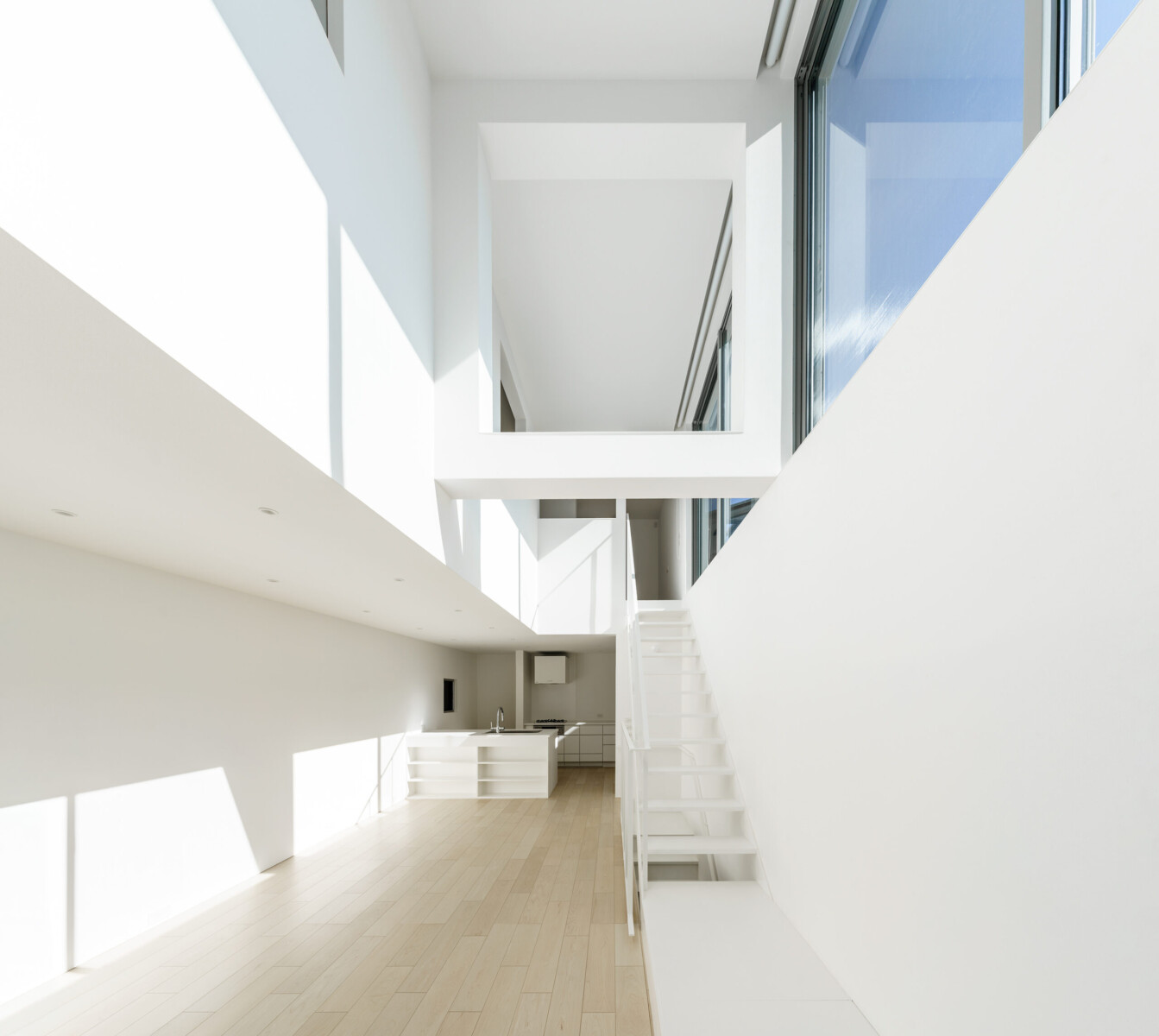 都市の中でより良い住環境を確保するために、2つの吹き抜けをデザインし、それぞれに南に開いた大開口を設計することで、光の溢れる内部空間を演出した。