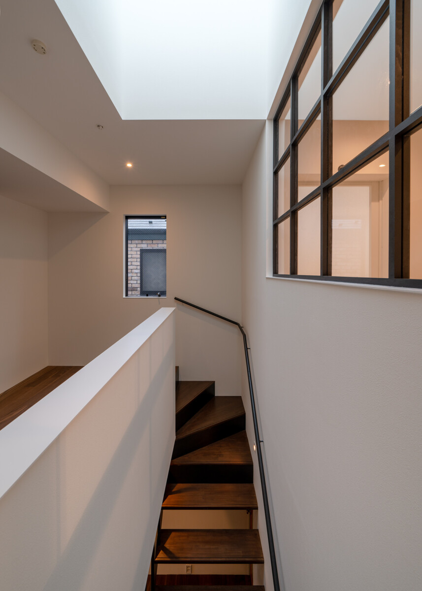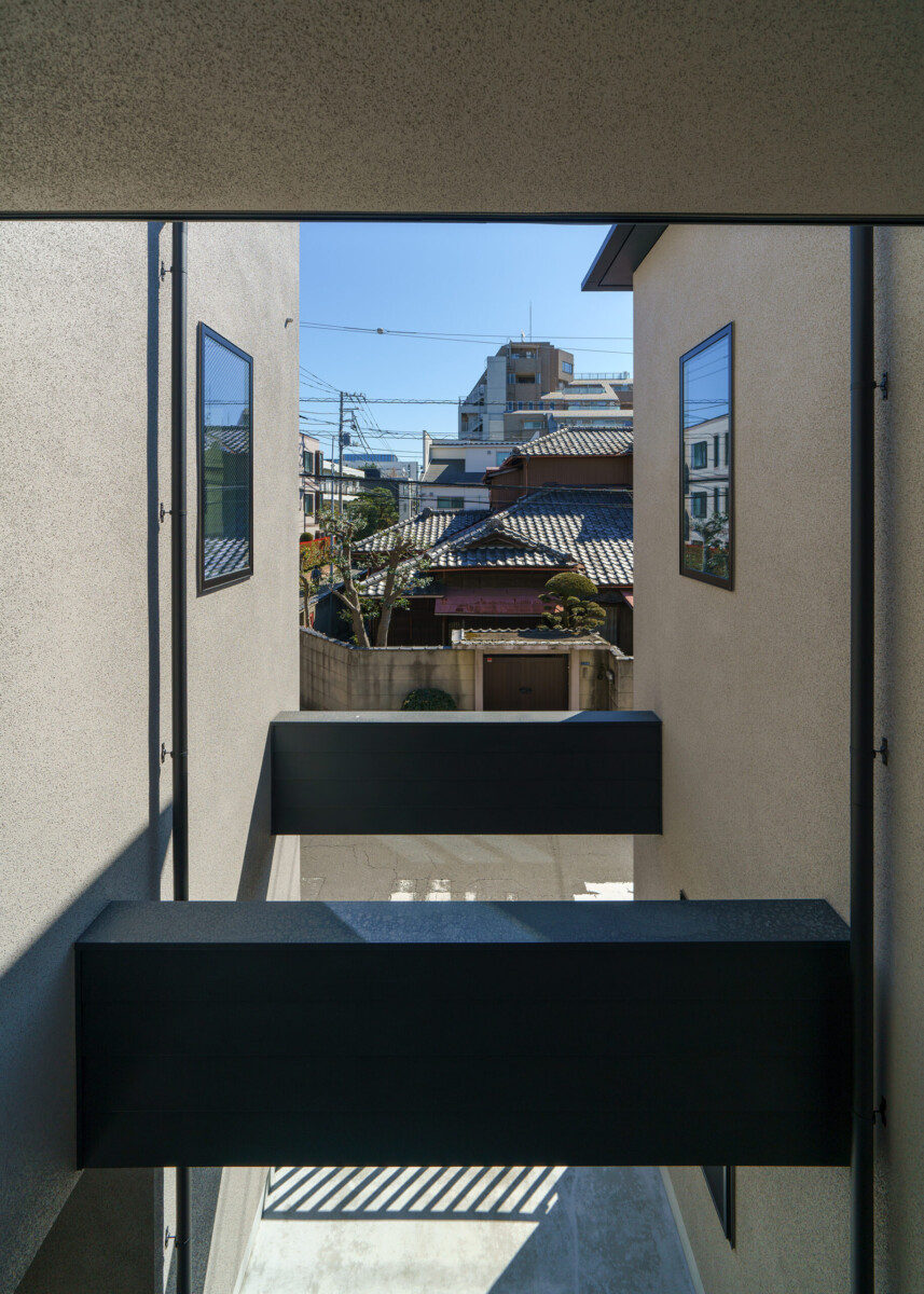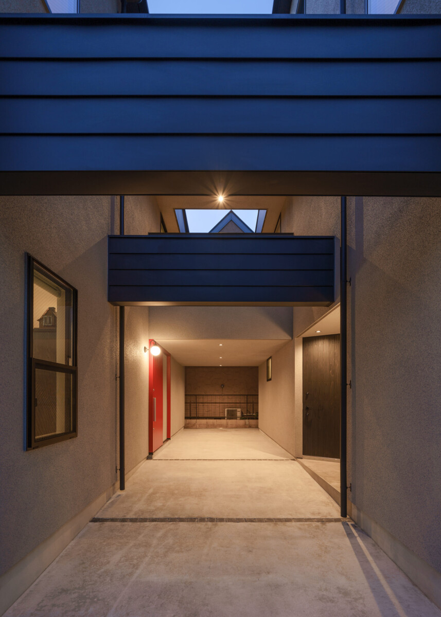 2つの塔に分節され、2つの塔に挟まれた共有テラスで、お互いが緩やかにつながる2世帯住宅。