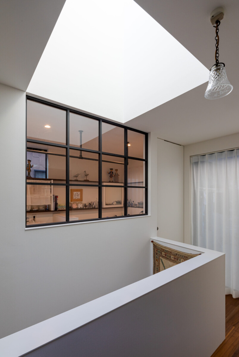 2つの塔に分節され、2つの塔に挟まれた共有テラスで、お互いが緩やかにつながる2世帯住宅。