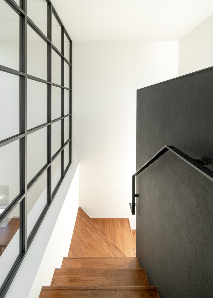 A two-family house that is segmented into two towers and loosely connected to each other with a shared terrace sandwiched between the two towers.