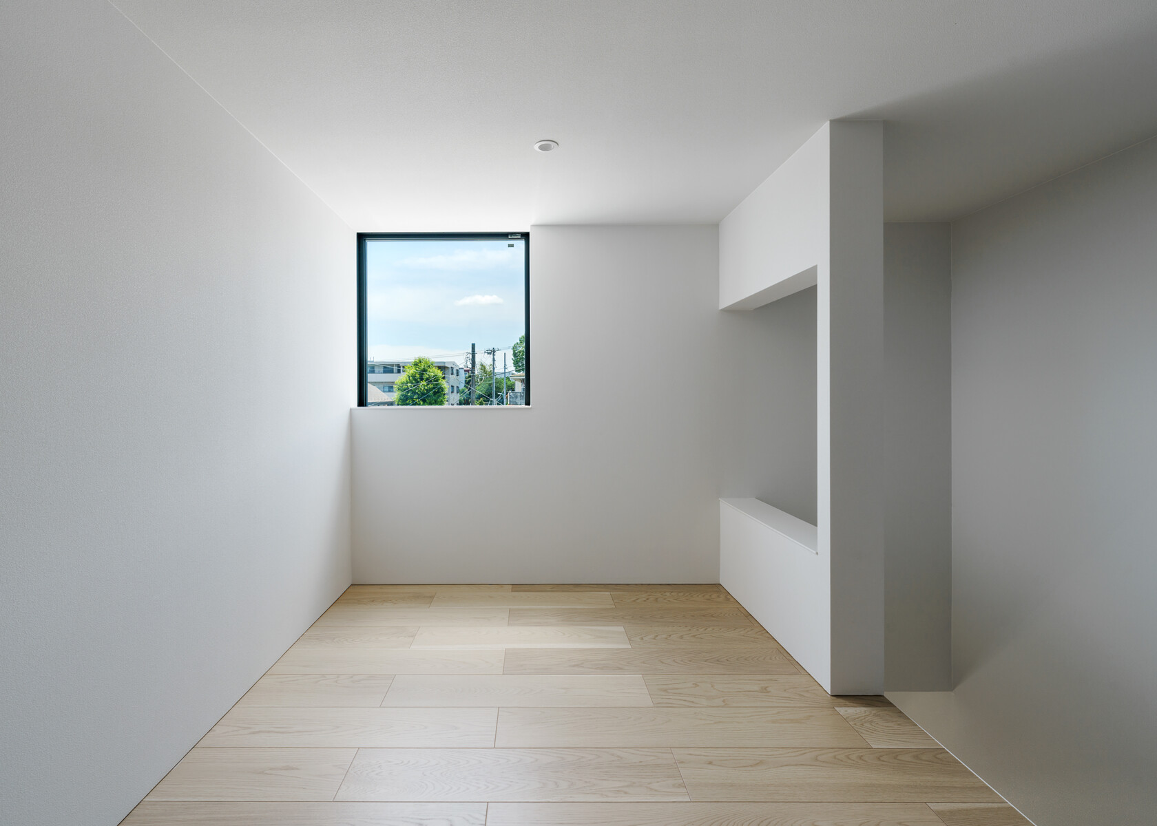 あえて少し下げた天井に天然木材を張った寝室は洞穴