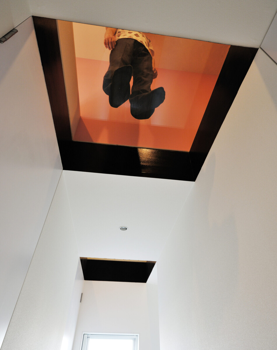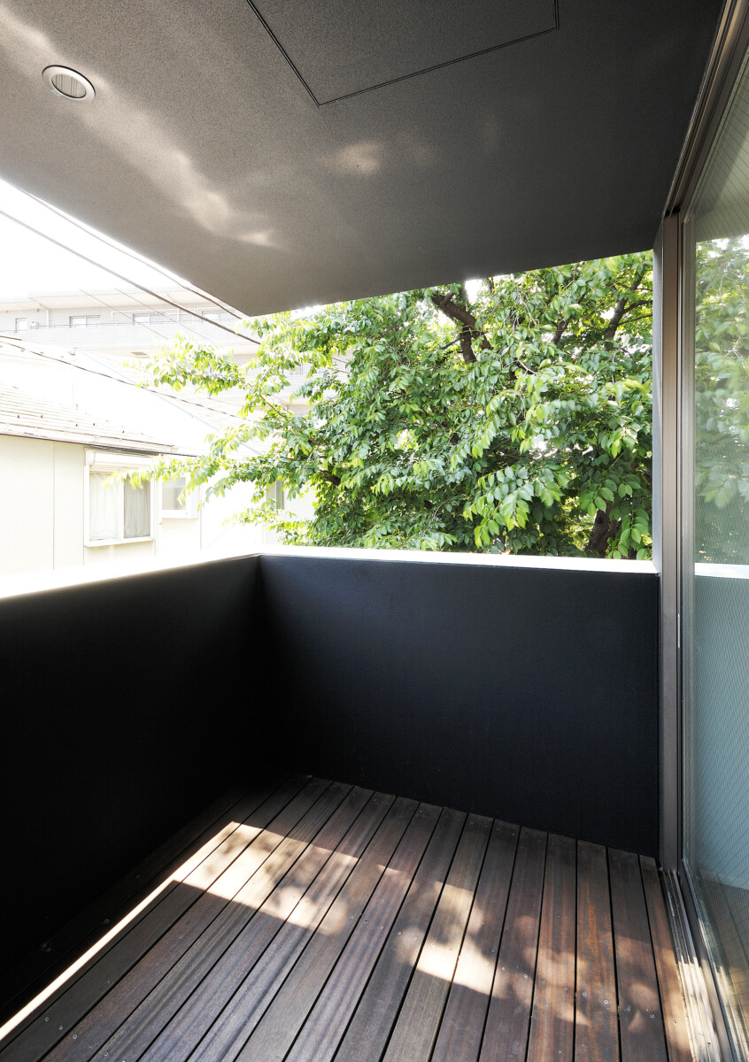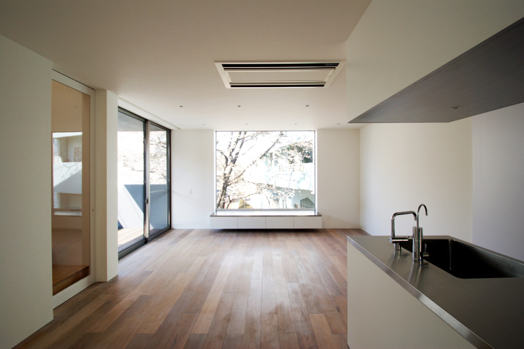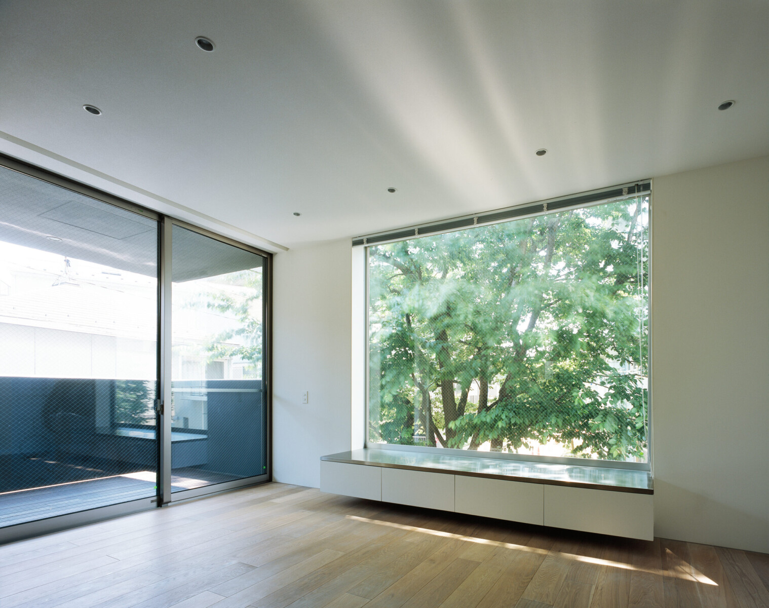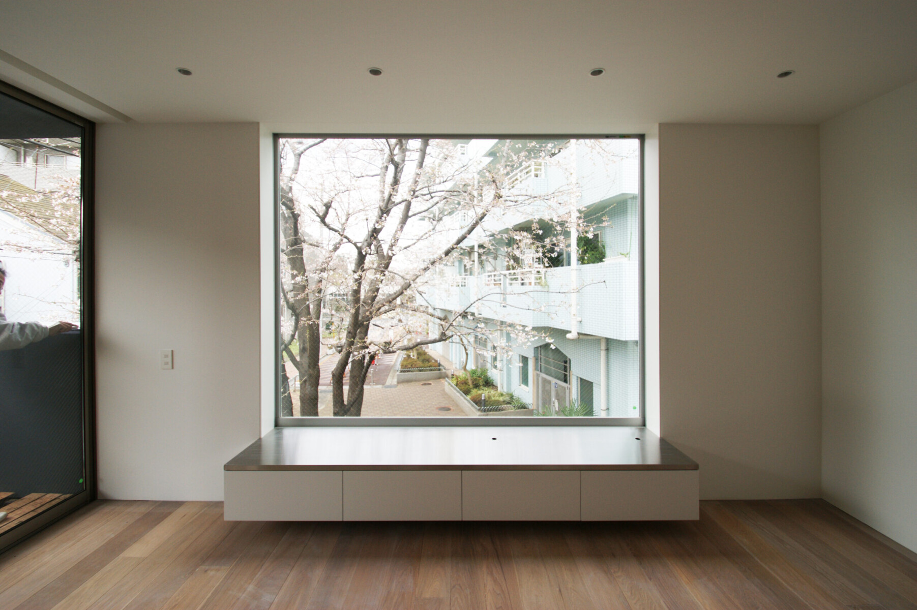リビングのピクチャーウィンドウは隣地の桜の大樹を絵画化し、黒く塗りつぶしたテラスは桜の大樹を切り取り内部空間に豊かさを取り込む。