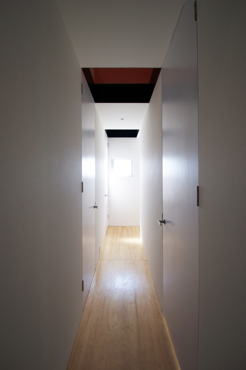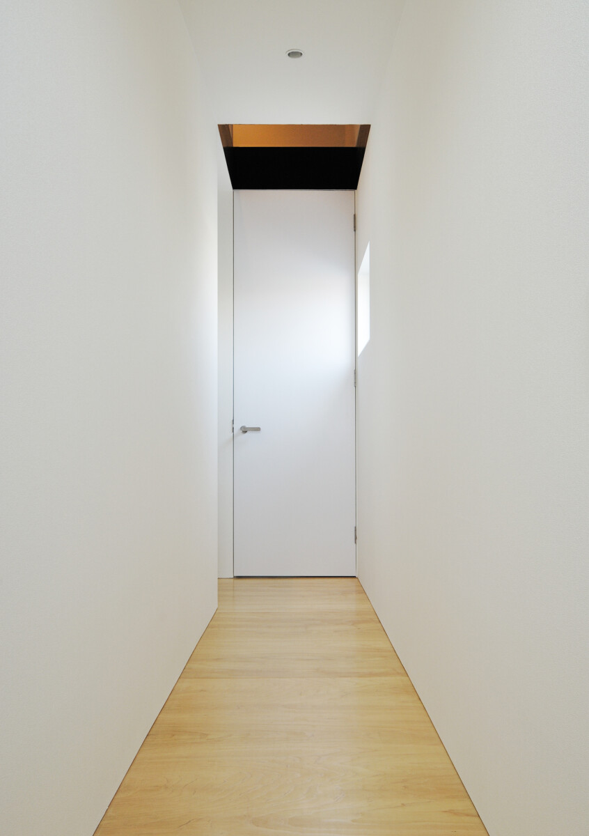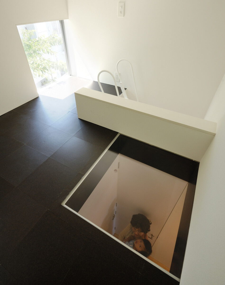 The picture window in the living room is a painting of a large cherry tree on the neighboring land, and the blackened terrace cuts out a large cherry tree to bring richness to the interior space.