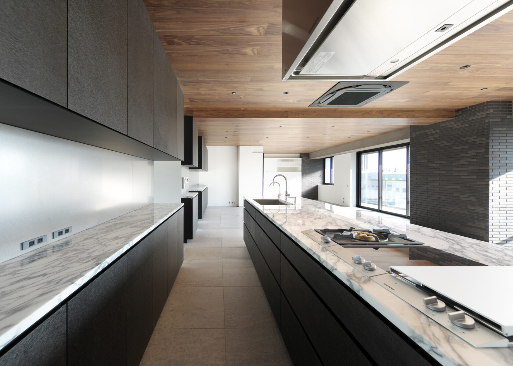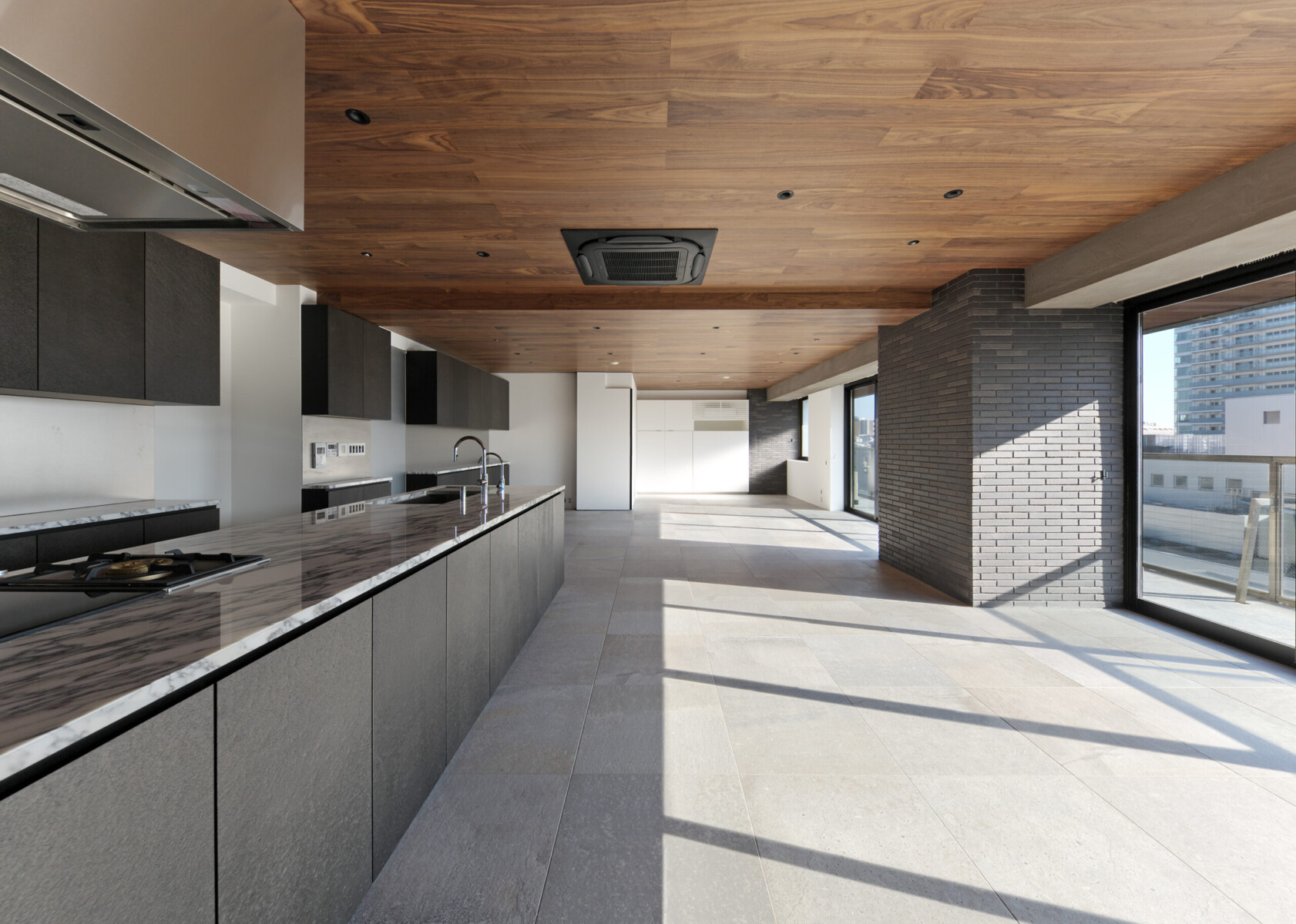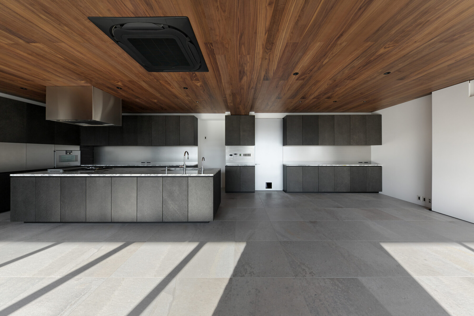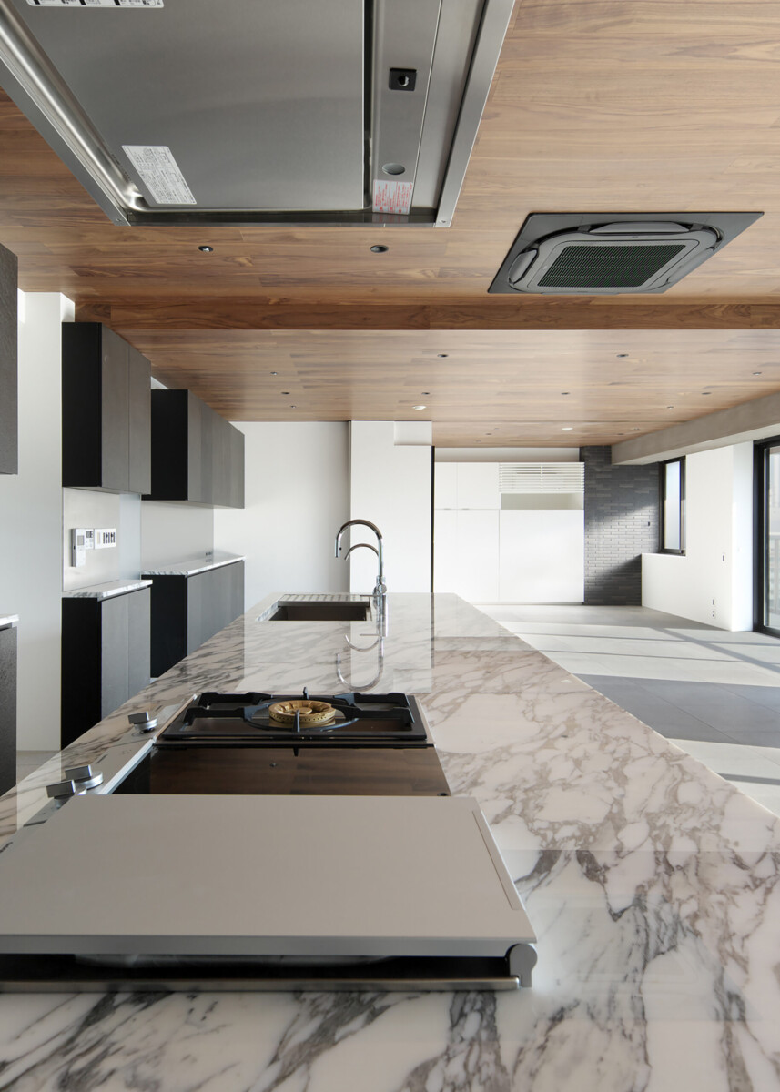 LDKの一角に鎮座する1m×3.4mのアイランドキッチンが空間のスケール感を混乱させる。