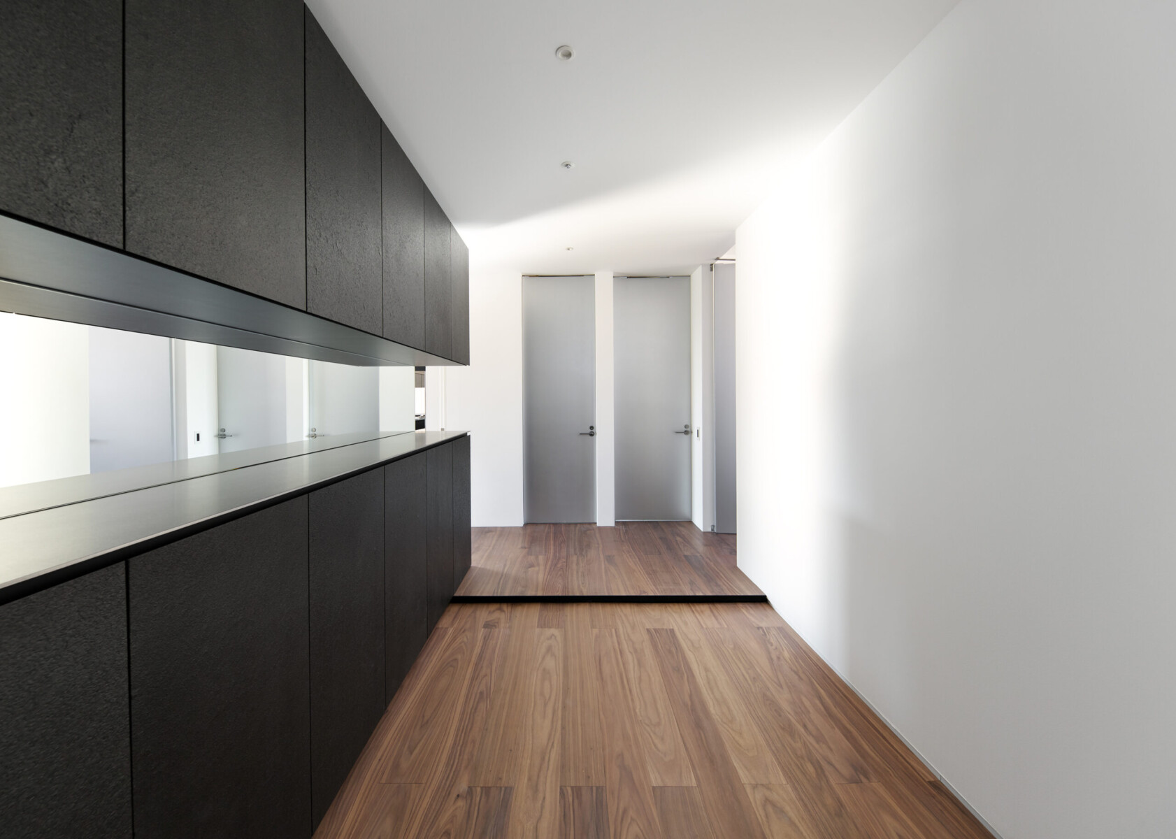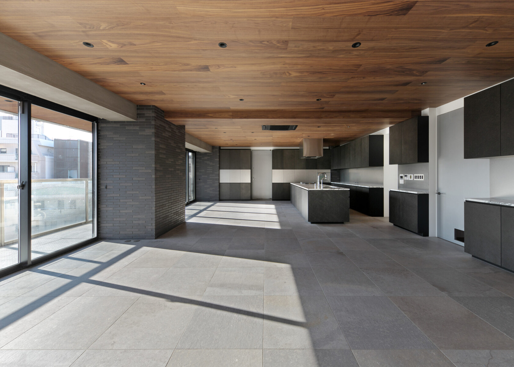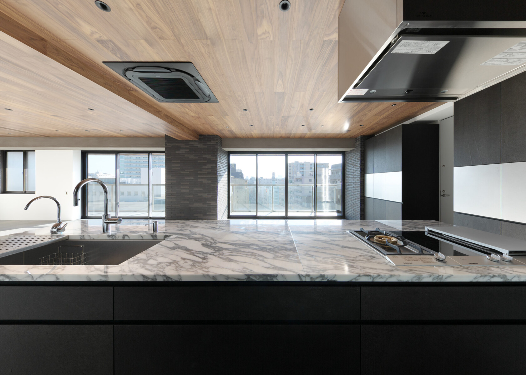 LDKの一角に鎮座する1m×3.4mのアイランドキッチンが空間のスケール感を混乱させる。