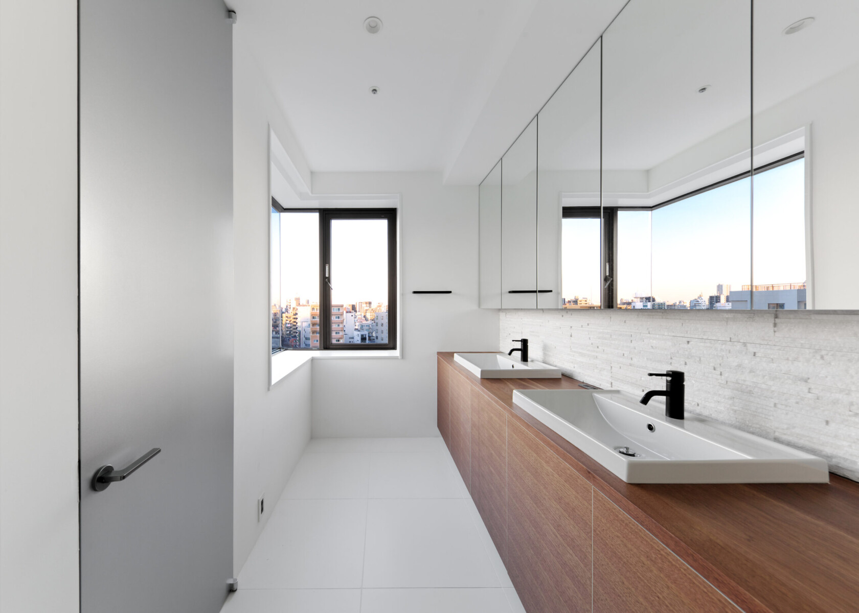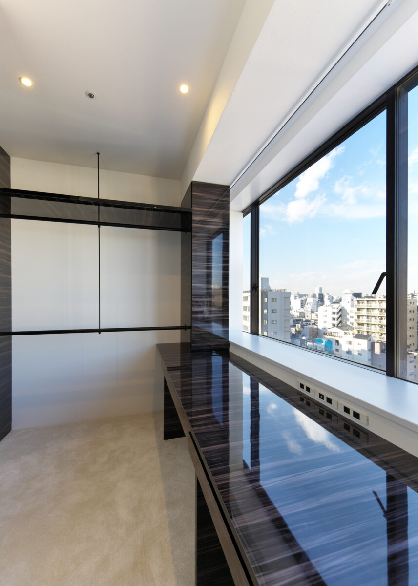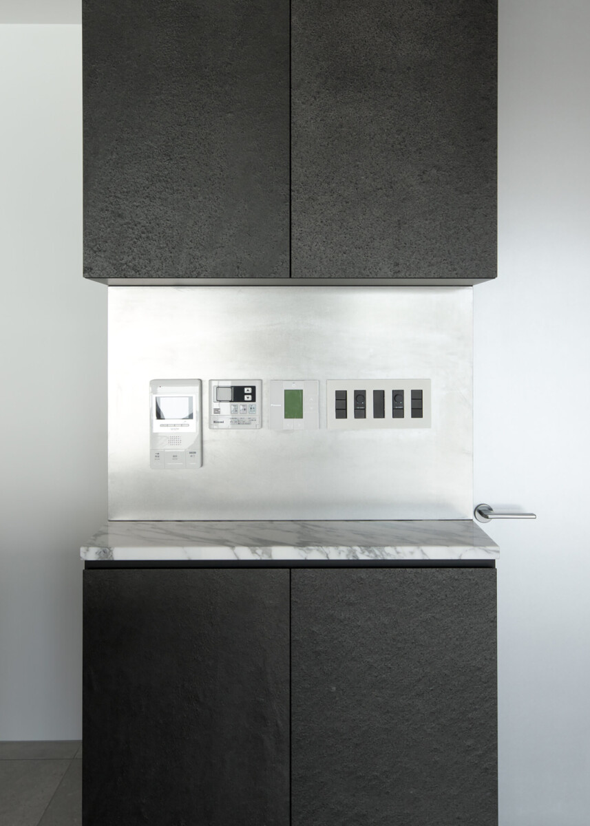 天然の石を特殊技術を用いて薄くスライスした建材を要所に使用し、デザインに深みと高級感を付加した。