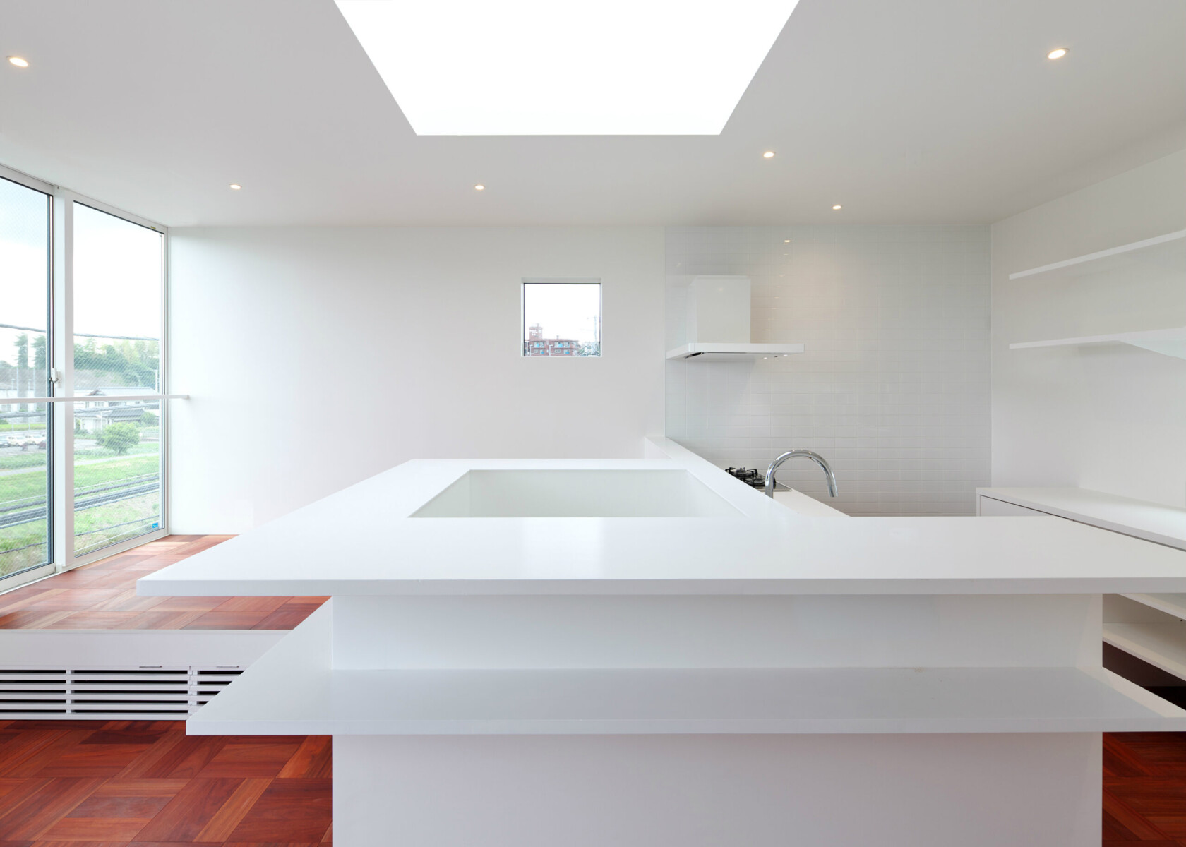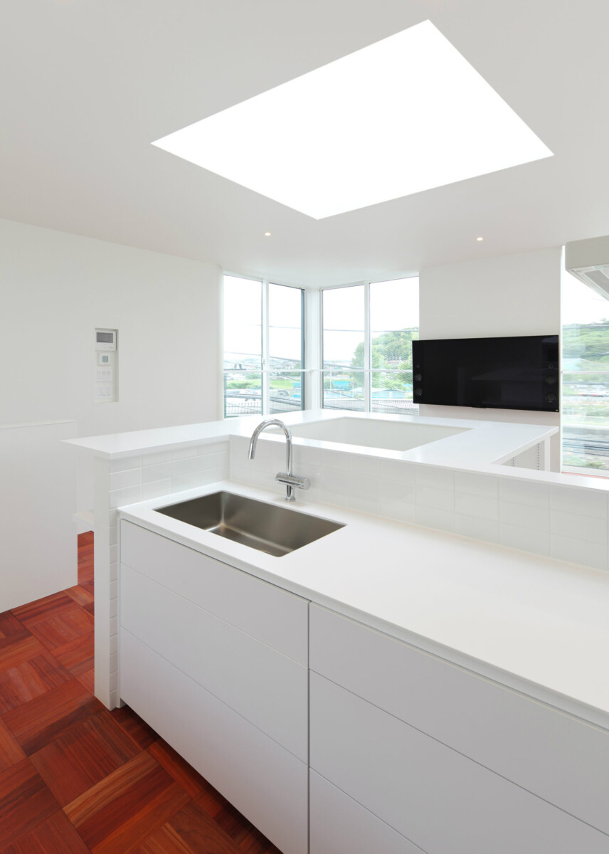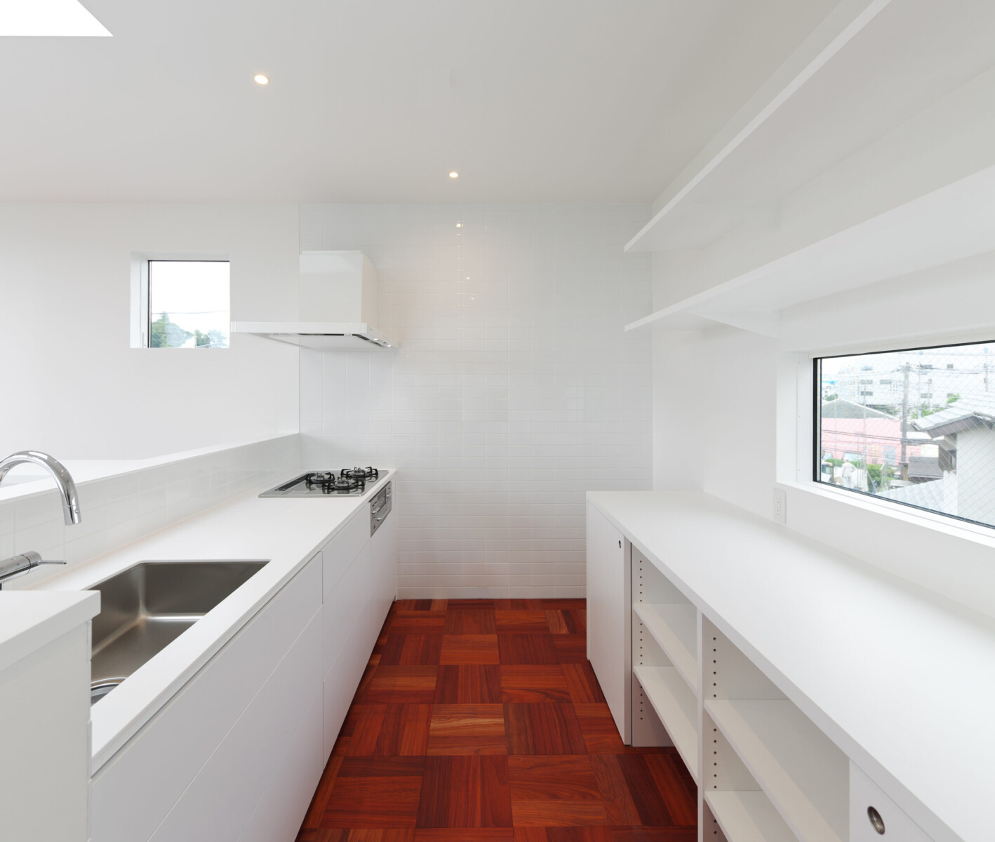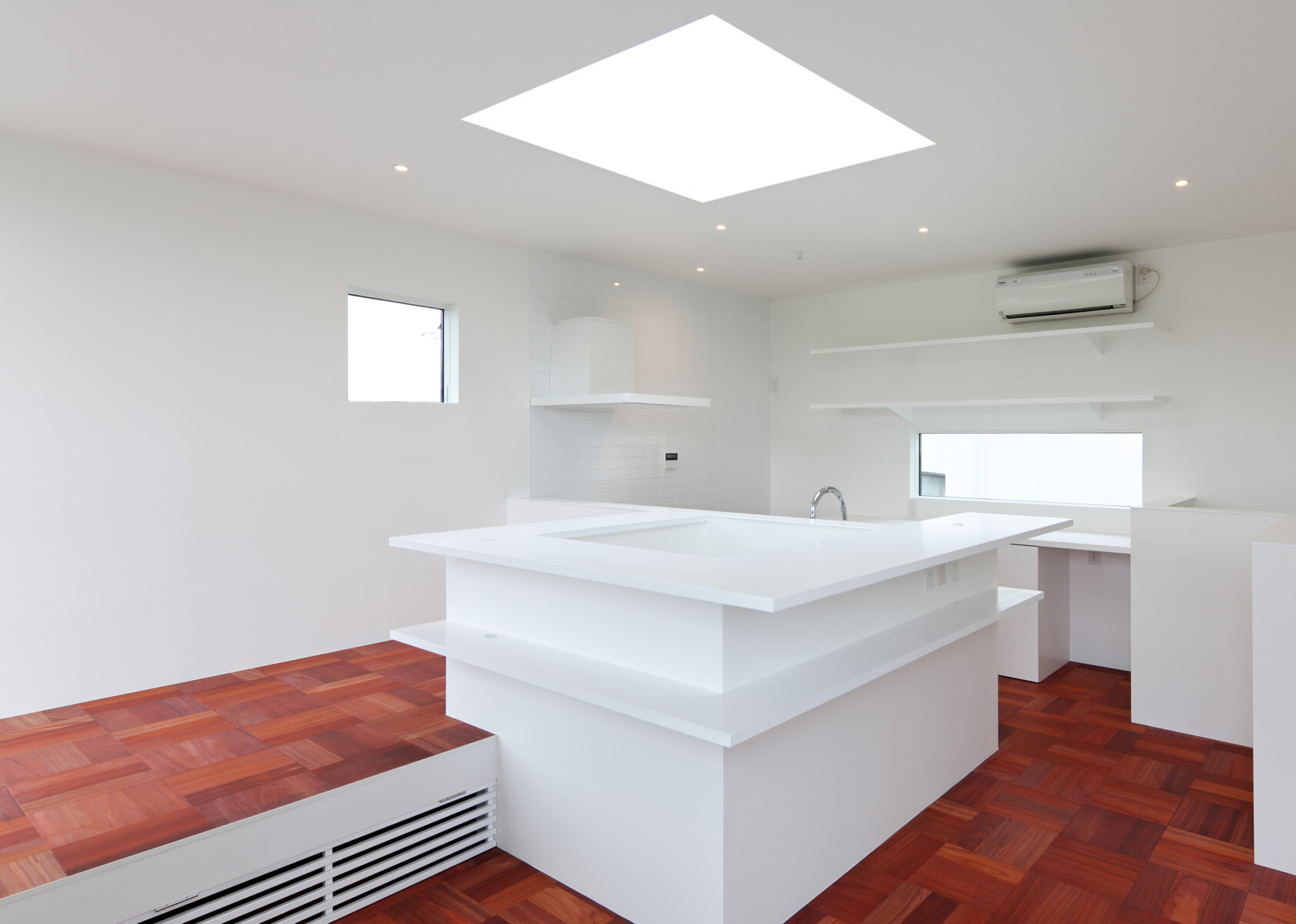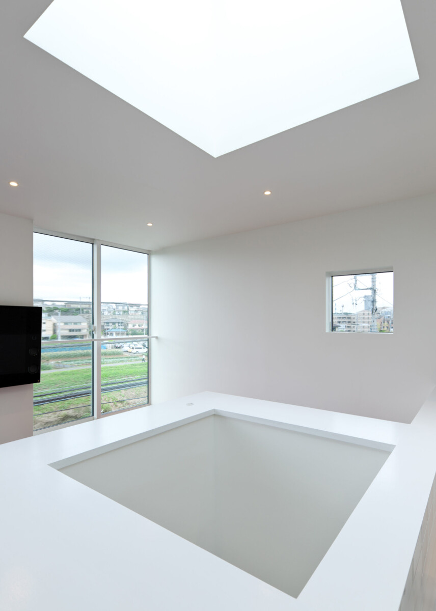 屋根に計画されたトップライトから3Fの吹抜けを通過して2Fまで光が届く「光の縦の道」をデザインした。